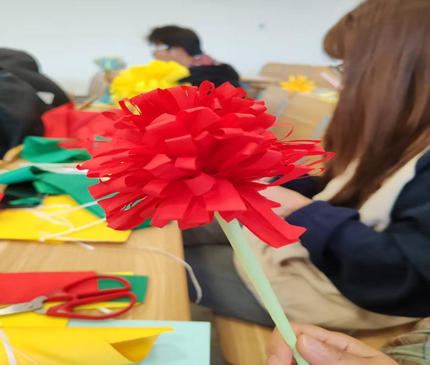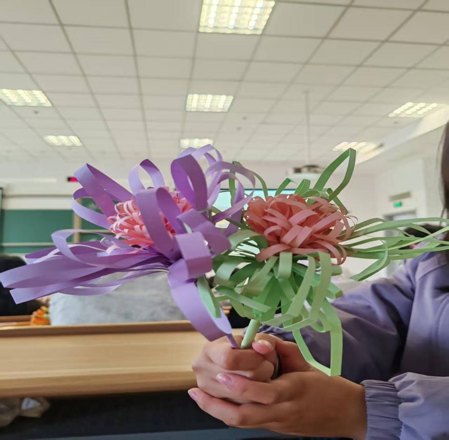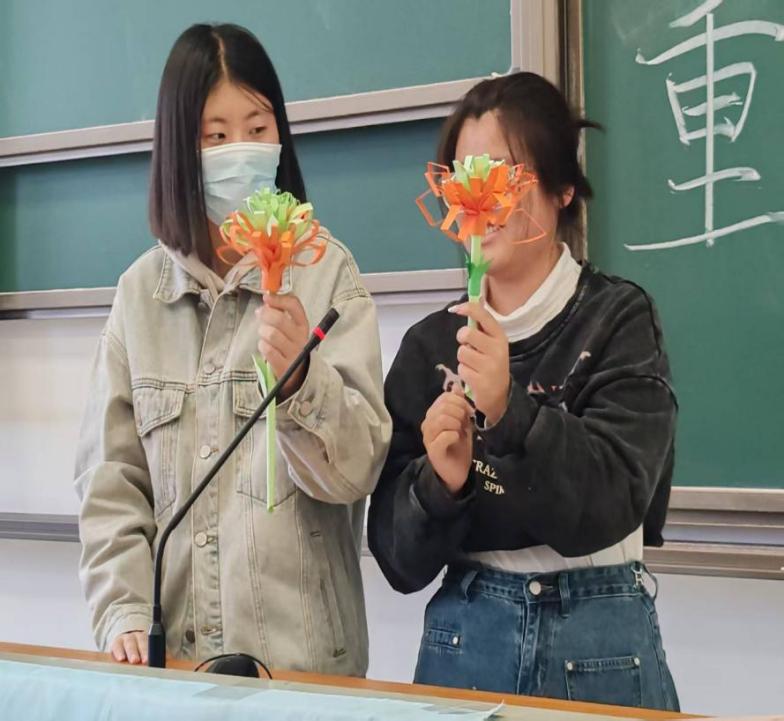 线下剪纸活动中,2-3人一组开启“菊韵创作”,同学们手持彩色A4纸与剪刀,或认真参照教程,或相互交流启发,将对长辈的祝福倾注于指尖。不少同学主动上台展示作品,并分享与家人的温暖回忆:“小时候外婆总在重阳煮菊花酒,今天剪一朵秋菊,想寄给远方的她”“这朵菊花要送给奶奶,感谢她一直支持我读大学”。分享者还获得了盲盒笔作为小礼品,现场掌声不断、笑语盈盈。