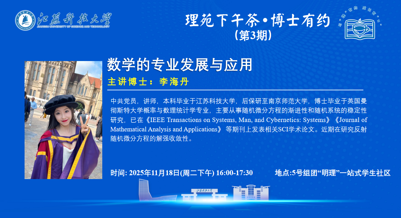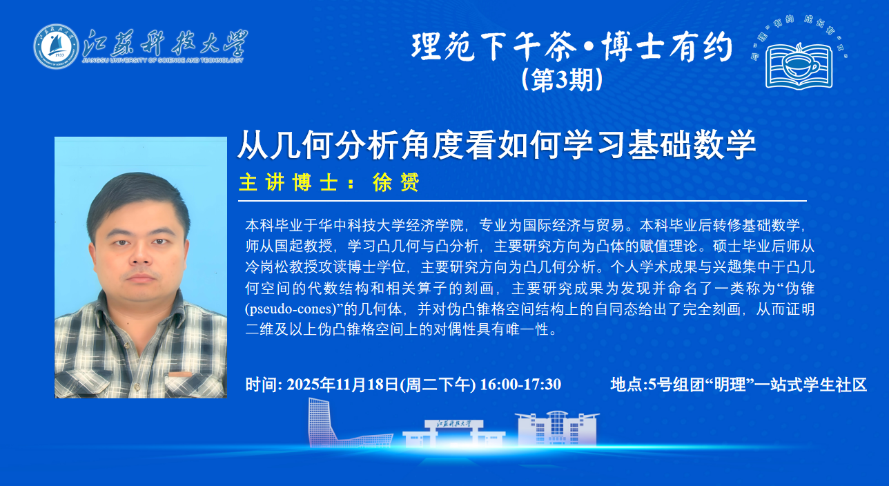 11月18日下午,理学院“明理”一站式学生社区功能型党支部在一站式学生社区举办“理苑下午茶·博士有约”第三期活动。信息与计算科学系徐赟博士、邱水寒博士、李海丹博士应邀与30余名2025级信计专业的新生共话“从几何分析角度看如何学习基础数学”“用数学构建网络模型”以及“数学的发展与应用”。活动由“明理”功能型党支部书记孙莞主持。