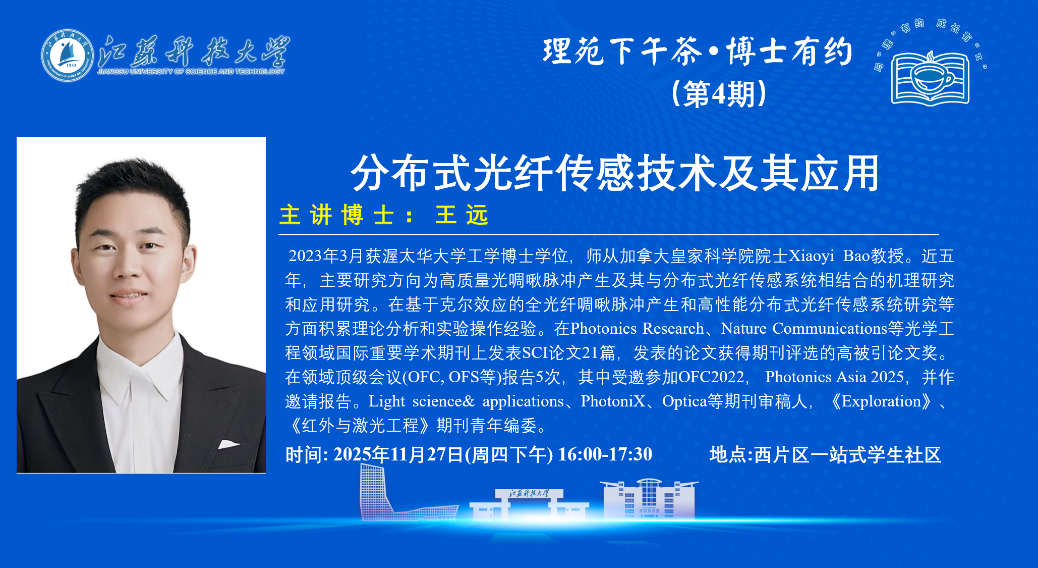 11月27日下午,理学院“明理”一站式学生社区功能型党支部在一站式学生社区举办“理苑下午茶·博士有约”第四期活动。光电信息科学与工程系王远博士应邀与20余名2024、2025级光电专业的学生共话“分布式光纤传感技术及其应用”。活动由辅导员贡一鸣老师主持。