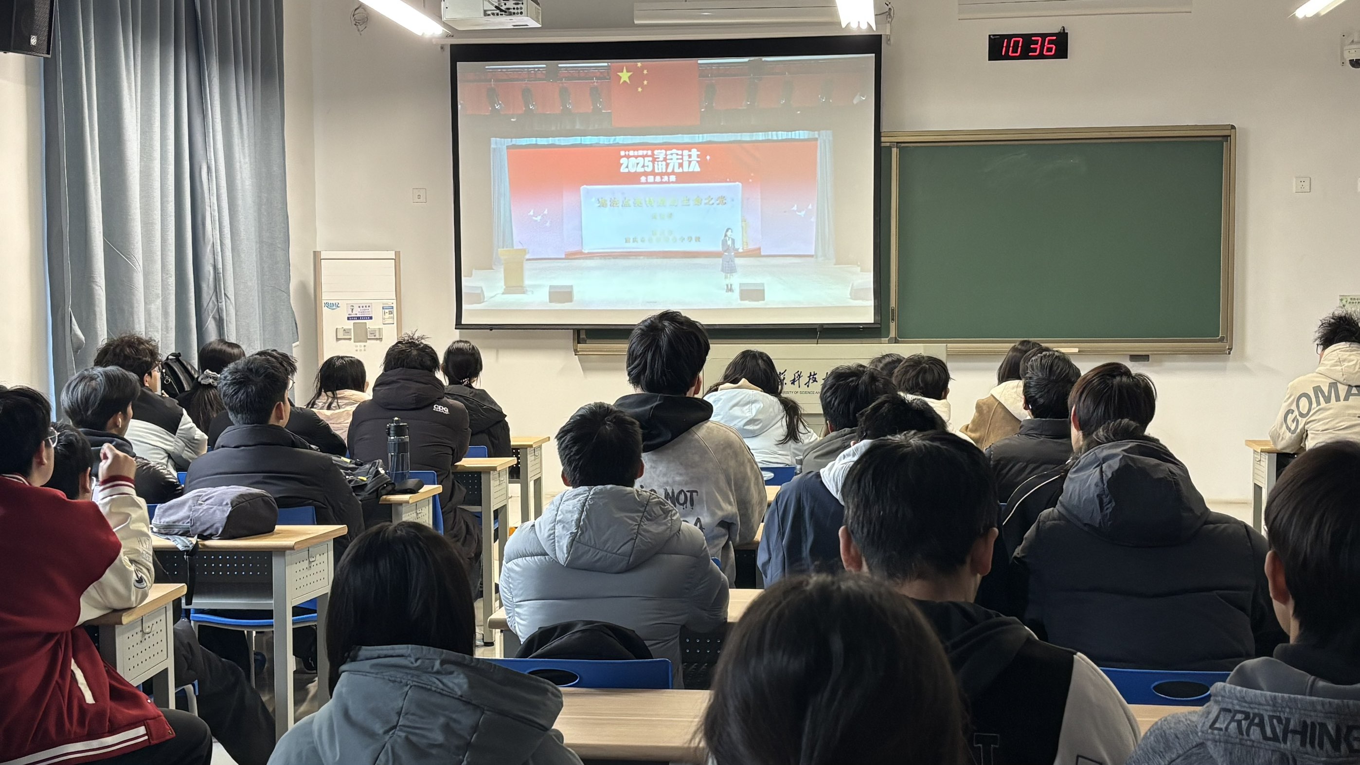 2025 年 12 月 4 日,江苏科技大学理学院的学生们在经世楼通过教育部全国青少年普法网同步观看直播,开展了一场宪法学习与晨读活动。