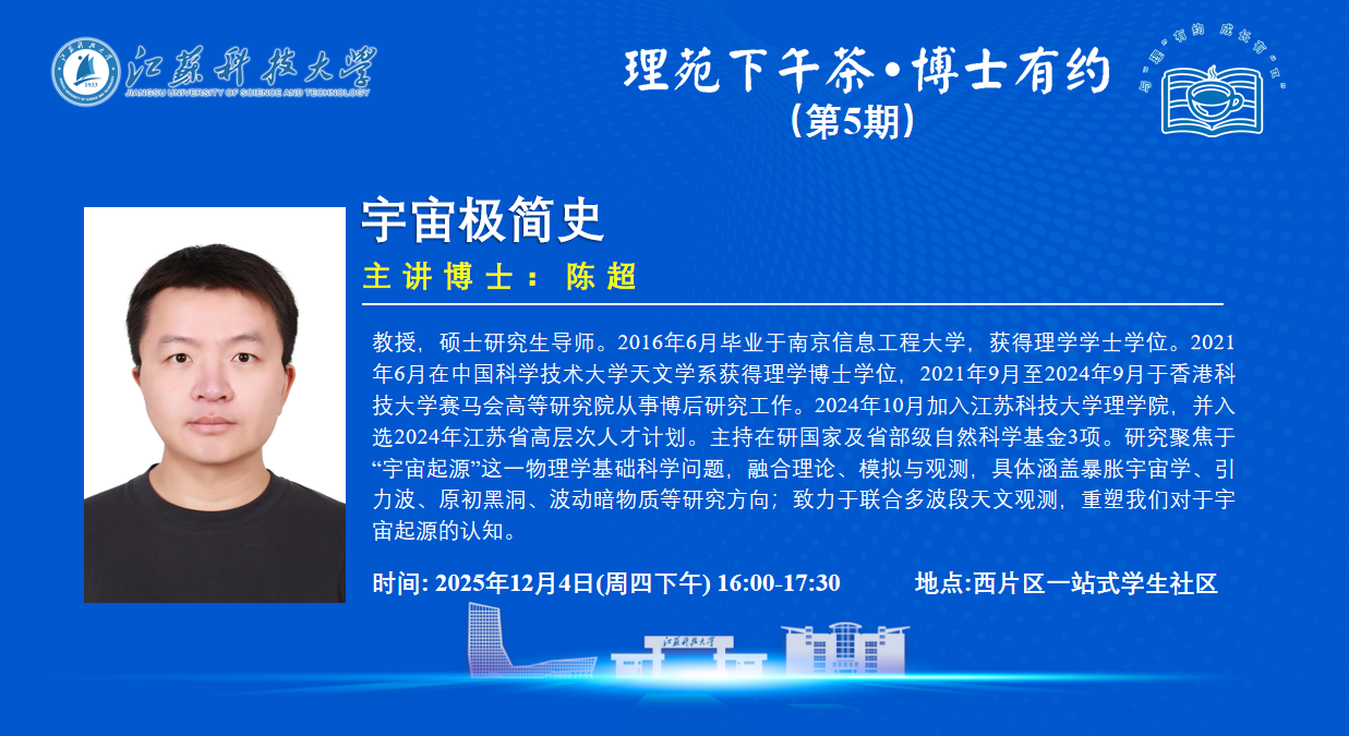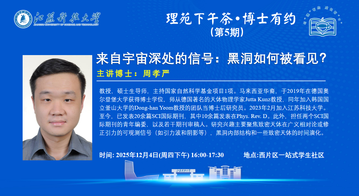 12月4日下午,理学院“明理”一站式学生社区功能型党支部在一站式学生社区举办“理苑下午茶•博士有约”第五期活动。应用物理系陈超博士、周孝严博士应邀与理学院30余名应物专业的学生共话“应用物理专业学习到宇宙学”“来自宇宙深处的信号:黑洞如何被看见”。本次活动由“明理”功能型党支部书记孙莞主持。