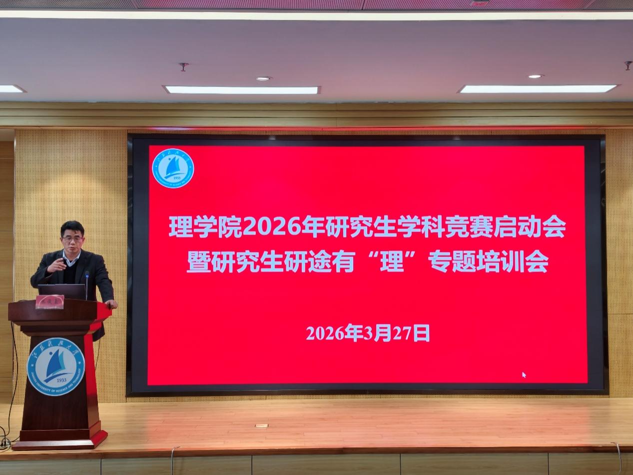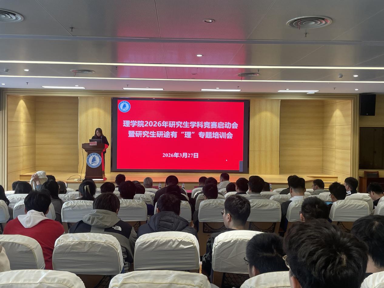 3月27日下午,理学院在图书馆B102举办2026年研究生学科竞赛启动会暨研究生研途有“理”专题培训会。理学院院长戴俊、副院长郭纪源,计算机学院党委副书记吴健康、环化学院副院长张俊豪、研究生导师及2024、2025级研究生等100余名师生参加会议。本次会议由理学院党委副书记周志辉主持。